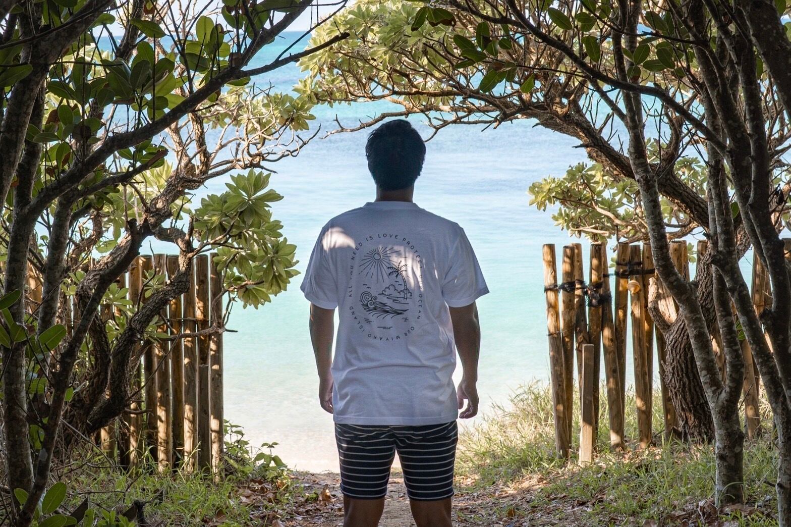 胸には「たんでぃがたんでぃ」沖縄県宮古島の方言で「ありがとう」という意味が書かれおり、背中には宮古島の「海・空・太陽」をイメージし、MIYAKO ISLANDとさりげなく書かれています。